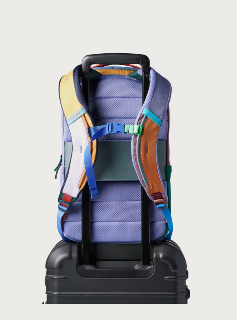 Back-panel handle acts as a pass-through so you can stack the pack on rolling luggage